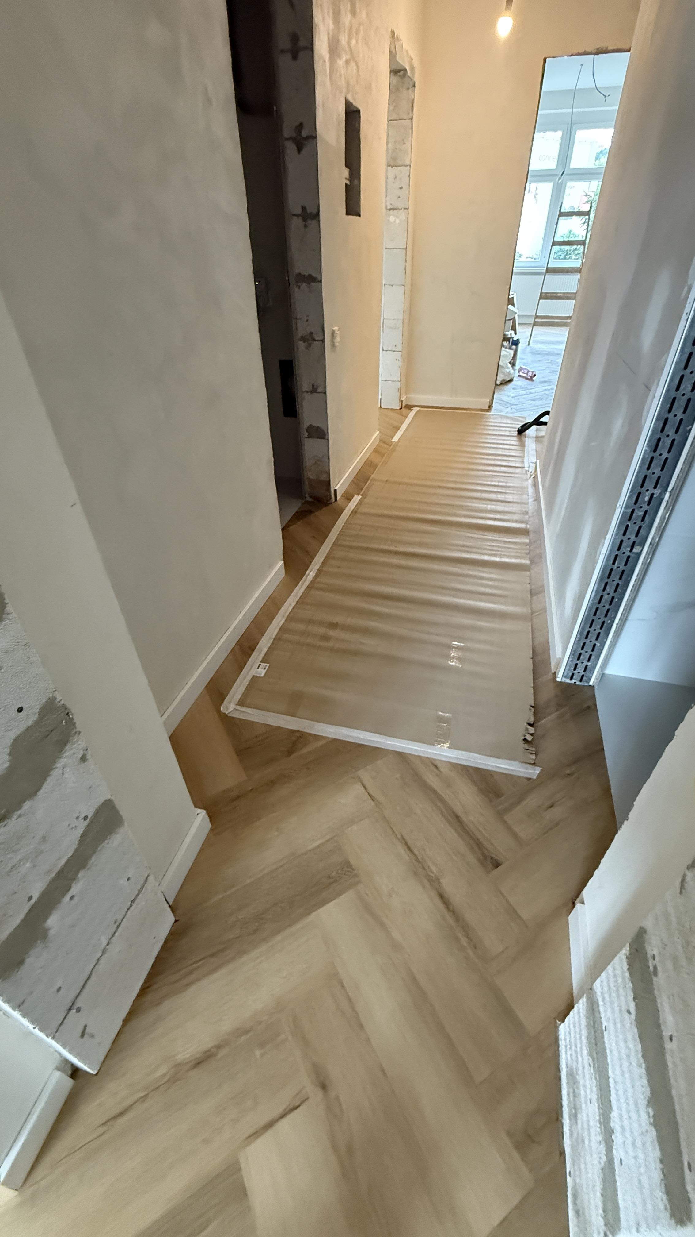 - Pokládka nové podlahové krytiny – bezesparého quartz vinylu ve vzoru „rybí kost“.